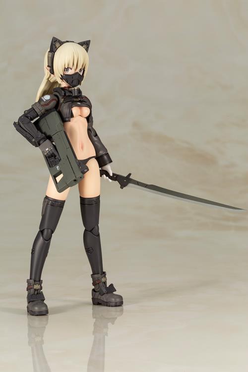 The model has been painstakingly developed with the sculpting and articulation that the Frame Arms Girl series is known for. She comes with three pre-printed face parts and can be assembled with or without the included hat. Multiple arm parts can be made for a variety of unique display options. Where weapons are concerned, her gunstock can be extended with the use of interchangeable parts, her scabbard can actually sheath her sword, her armor doesn't get in the way of her movement, and decals are also included.