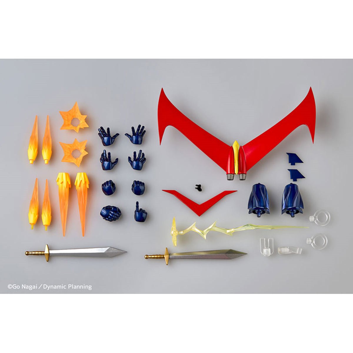 The weapons, each with their own deadly power, such as the "Drill Pressure Punch", "Great Boomerang", "Mazinger Blade", and "Thunder Break", come with interchangeable parts and powerful effects. The flying wing "Scramble Dash" that unfolds from the back can be attached by replacing the base parts, and the flying tail that unfolds from the calf is also reproduced as an additional part.