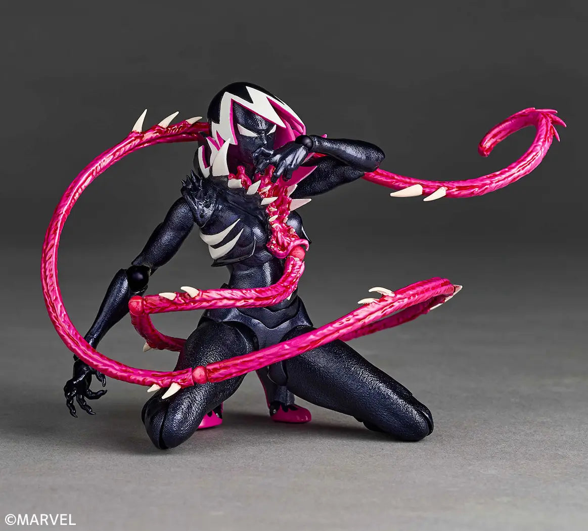 A jet-black figure wrapped in a symbiote, with Venom's fanged jaw arranged as Parker's hood. The design, which skillfully mixes pink, which is the image color of Spider Gwen, shines in supple proportions! The symbiote that overflows from the collar of the hoodie comes with six parts that can be connected with joints, in addition to those that wrap around the body. By rearranging it, you can create a look of wielding it as a weapon that can be controlled freely.