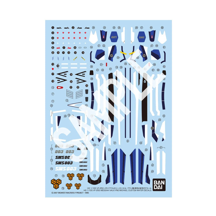 Bandai presents a decal set created specifically for the 1/100-scale HG VF-25G Messiah Valkyrie (Michael Blanc Custom) from Macross Frontier. It includes a broad selection of caution labels and detailed markings to enhance accuracy.