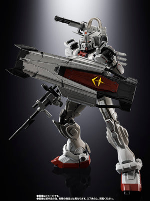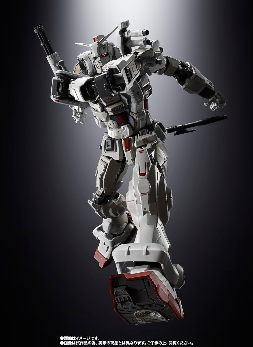 The Gundam has been recreated down to its minute details, with characteristic proportions. This large scale figure has a height of approximately 185 mm. Diecast parts are used for the joints and armor to give the figure a weighty feel. A light emitting LED gimmick is encapsulated in the head, so you can reproduce the image of the Gundam from the series. All types of memorable armaments in the series are included as accessories, so you can use them to strike various action poses with the figure.