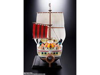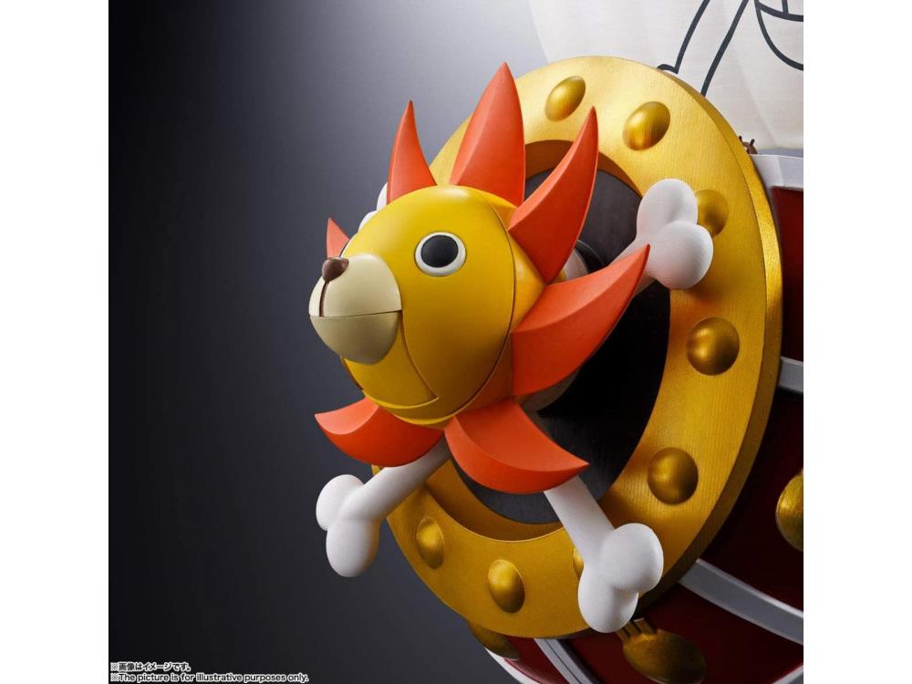The Straw Hat Pirates' ship, Thousand Sunny, joins the Chogokin series in a super-satisfying large scale,14.96 inches long and 9.06 inches tall! This definitive collectible of the famed carrack ship incorporates a rotating Soldier Dog System and Gaon Cannon features five mini-machines and removable sidewalls to reveal the interior spaces within! It's a one of a kind portrayal fans won't want to miss. The crossbone parts act as a switch to open the Gaon cannon and the Chicken Voyage rotates!
