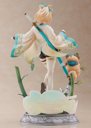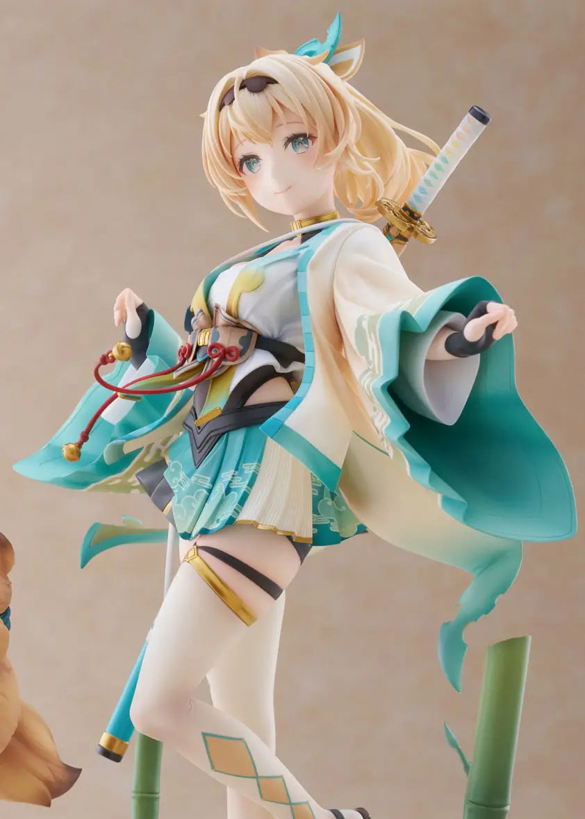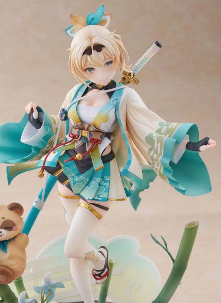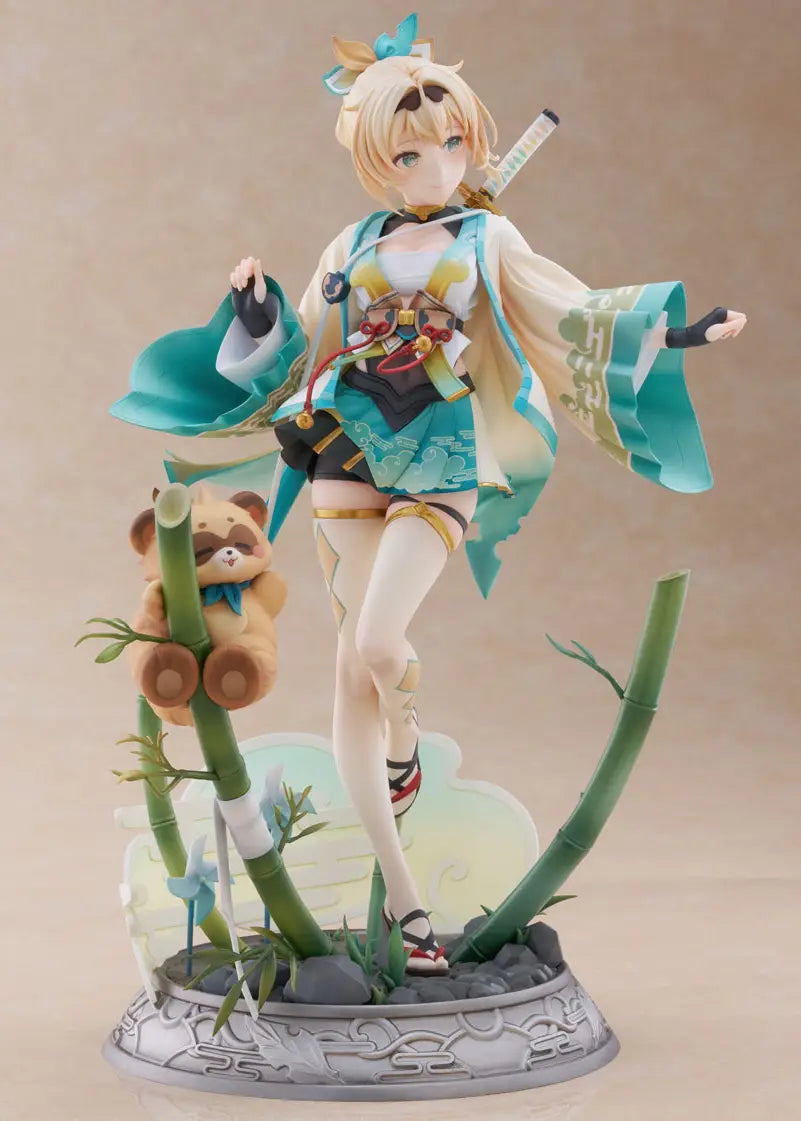 Iroha Kazama from "hololive production" is the subject of this delightful figure from Claynel! Her smile is as sweet as a summer morning, and a refreshing breeze makes her pale golden hair and colorful haori flutter slightly; the huge sword she carries across her back enhances her dignity as a samurai. Her friend Pokobee is round, fluffy, and adorable! You'll love her base, too, reminding you of the scenery deep in the mountains with its bamboo and carved stone look. Order her for your own collection today!