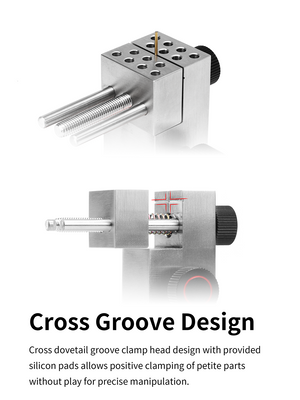 Cross Groove Design: Cross dovetail groove clamp head design with provided silicon pads allows positive clamping of petite parts without play for precise manipulation.