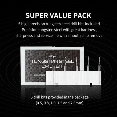 5 drill bits provided (0.5, 0.8, 1.0, 1.5, and 2.0mm)