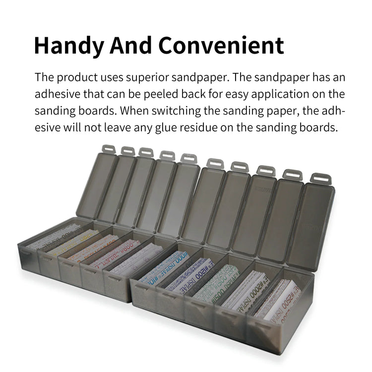 Pre-cut self adhesive sandpaper set. Includes a 5 compartment storage box able to hold all your sandpaper in a convenient storage case!
