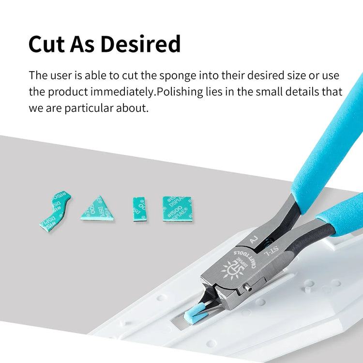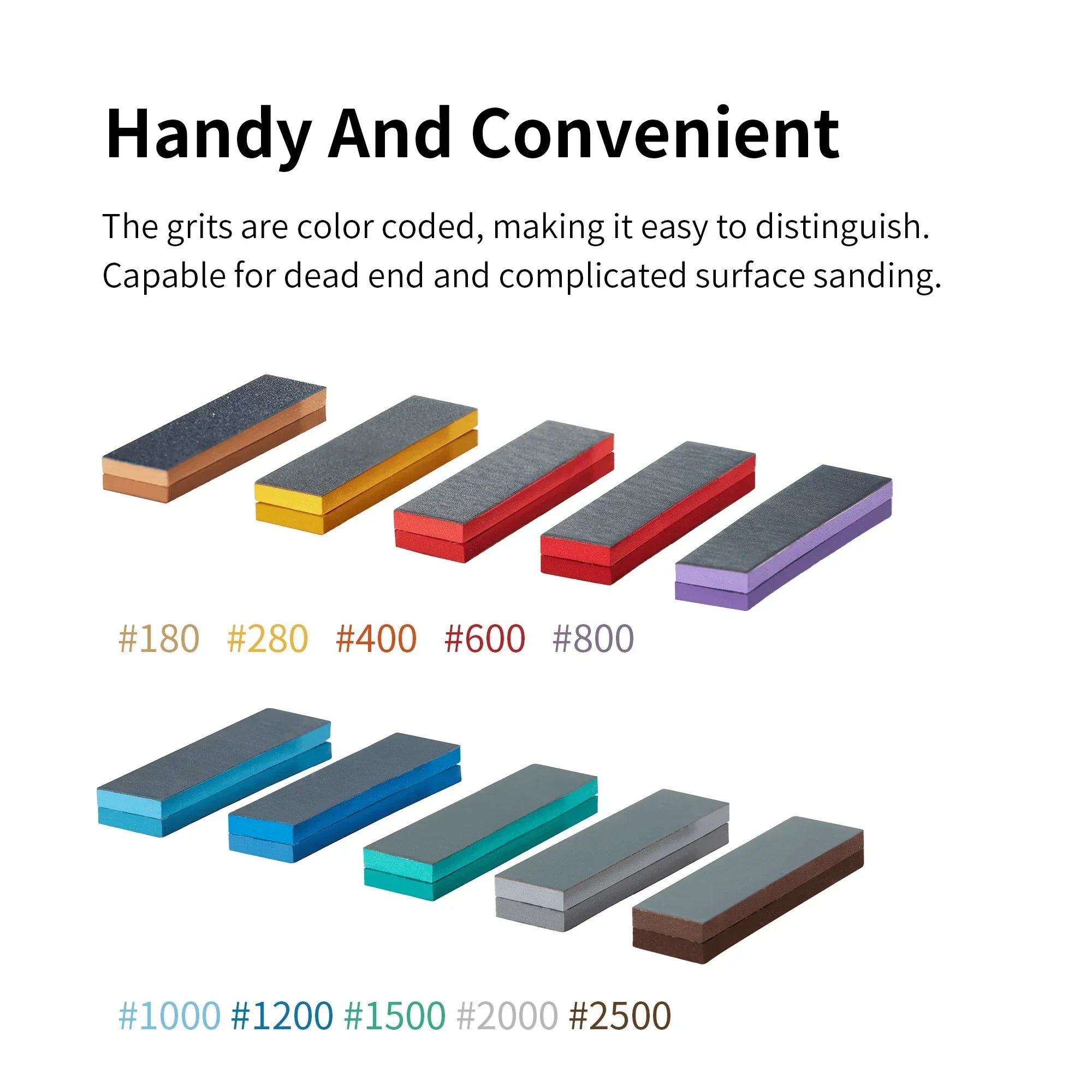 The user can use coarse grits on pieces that require less precision in the sanding. The sanding block is made from EVA material that is soft and flexible, perfect for sanding curved edges. The grits are color coded, making it easy to distinguish. Grits are labeled clearly at the back, allowing users to choose their tools without hassle. With three thickness to choose from, it is versatile for any situation. Every set comes with 2 of each thickness for each grit. The user is able to cut the sponge into their desired size or use the product immediately. Freely customize to your desired size. Use your first and middle finger to hold the sponge. Apply force with your index finger for maximum effect. Made from memory foam, the sponge always goes back to its original shape.