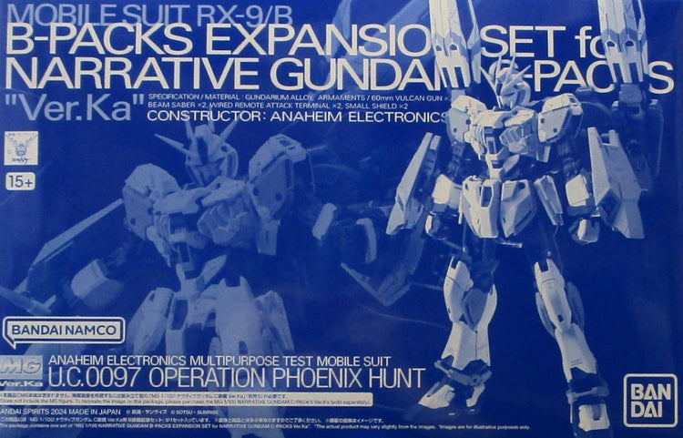 Combine this option expansion set with the sold separately MG Narrative Gundam C-Packs Ver. Ka to turn your Narrative Gundam into its B-Packs configuration. This set features also features 2 weapon stands for displaying the wire-guided assault units and water slide decals.