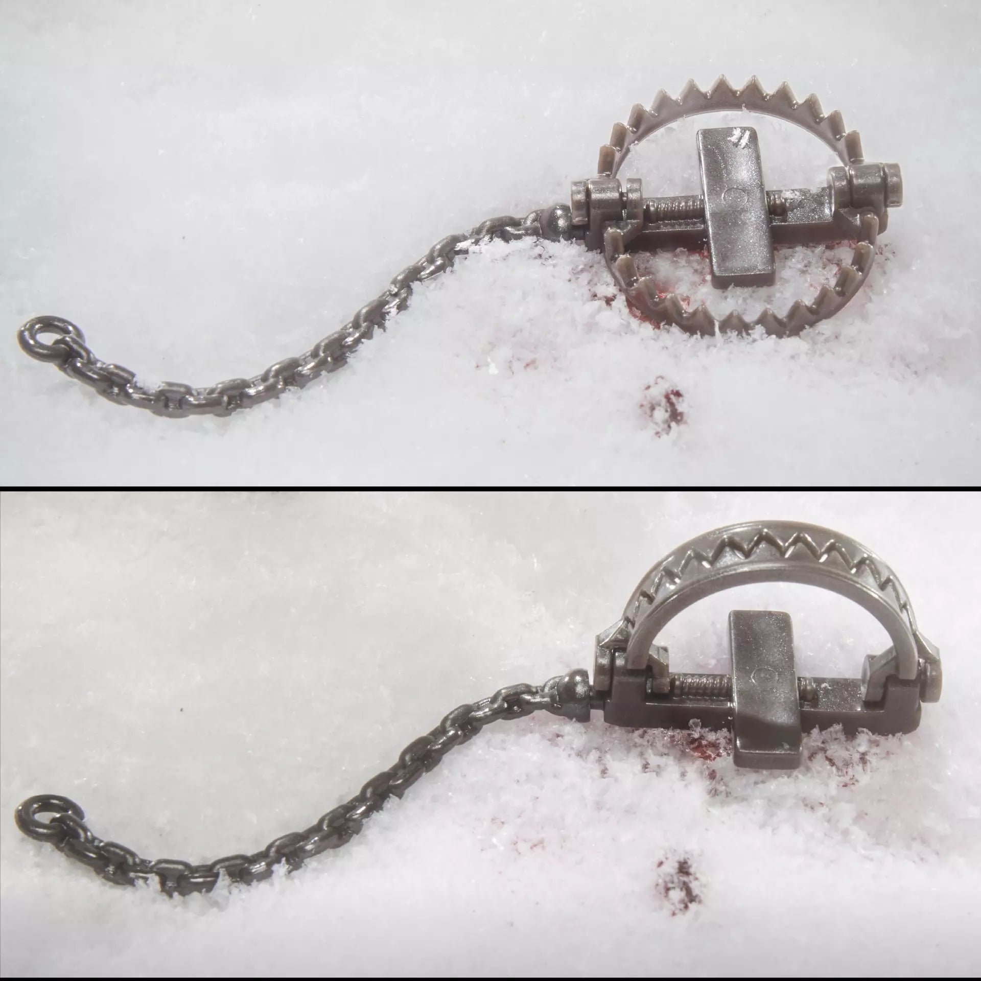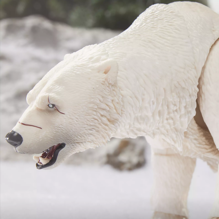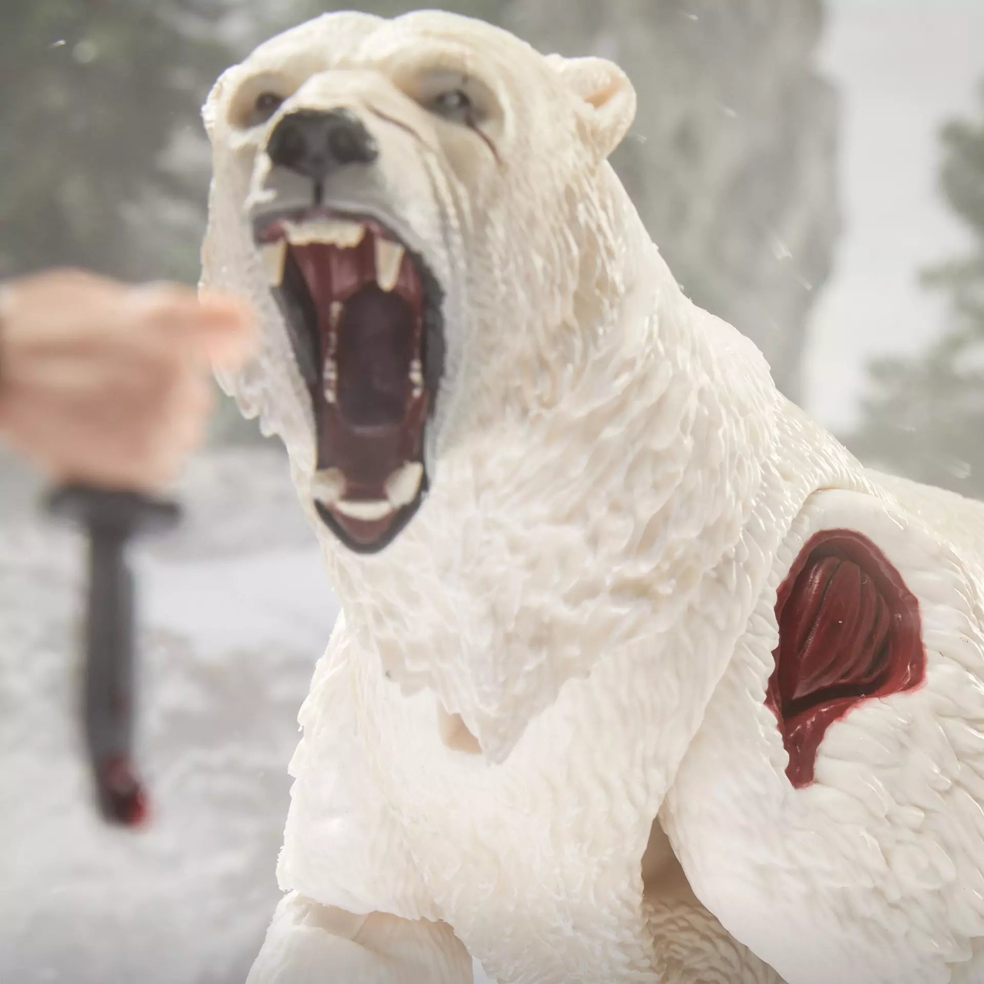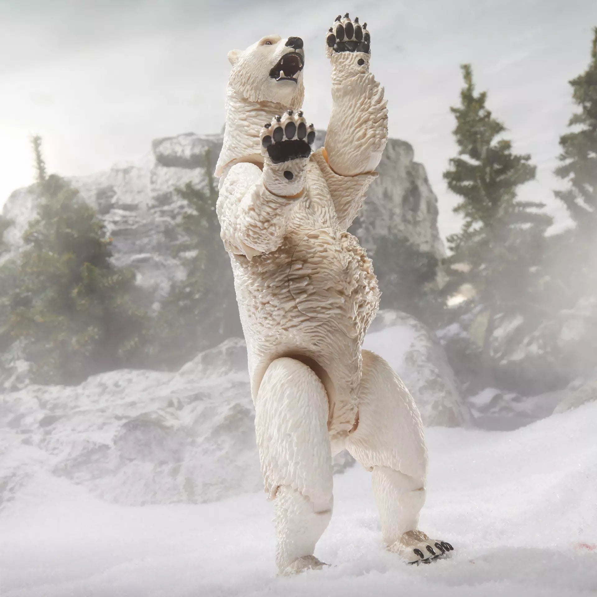 The Snake Eyes figure contains 15 character-inspired accessory pieces including bear trap with chain, 3 alternate sets of hands, M.A.S.S. collection cannister, catalytic element crystal in a clear container, knife, and weapon accessories. The Polar Bear has and alternate growling head and swappable battle-damaged shoulder piece.