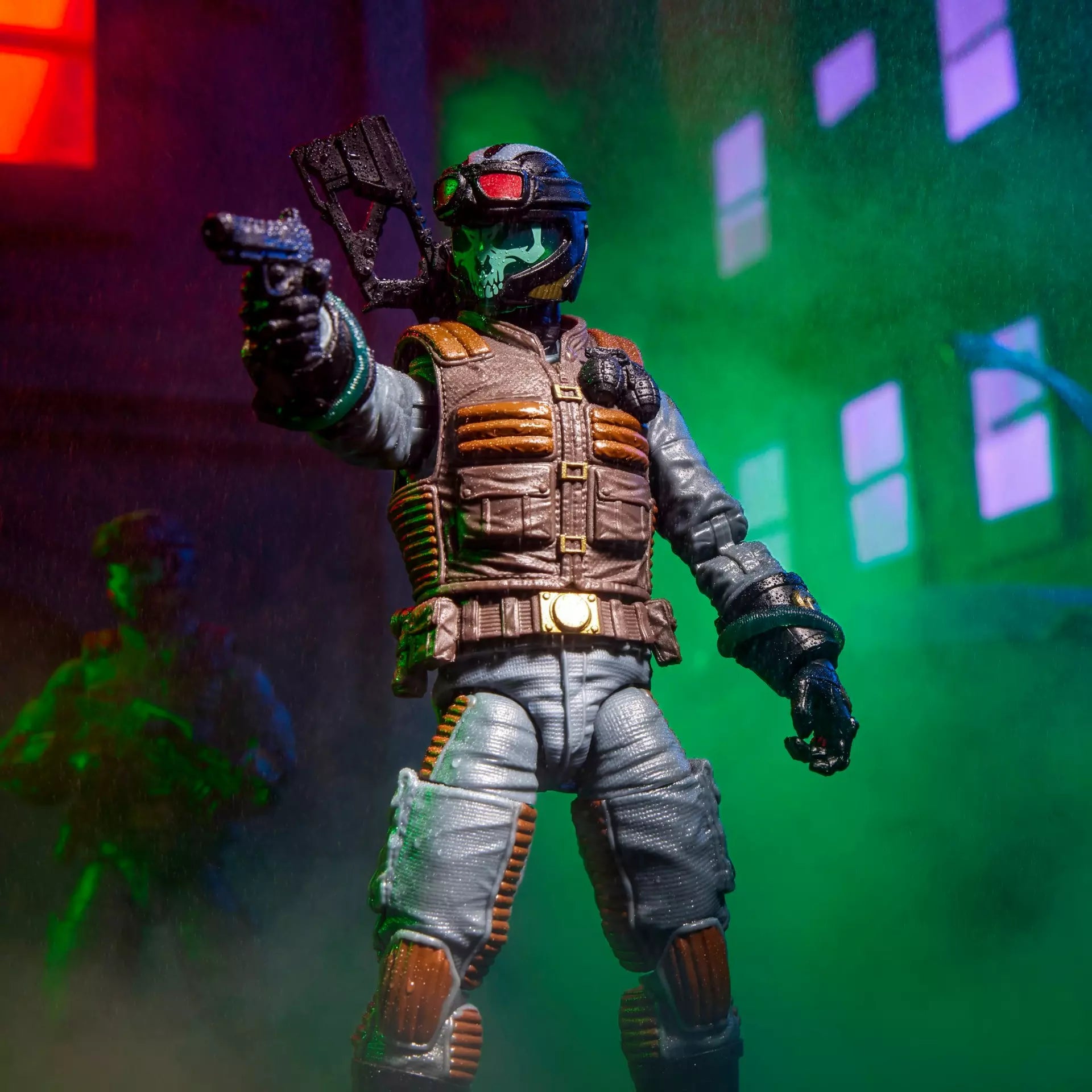 This Ghost Viper figure contains 16 character-inspired accessory pieces including D.I.R.E. Containment Pack, hose, Projector, alternate helmeted head, goggles, alternate hooded cobra and werewolf spectral head manifestations, 2 D.I.R.E. claws, 2 gas effects, skull projection effect, D.I.R.E. snake, and weapon accessories.