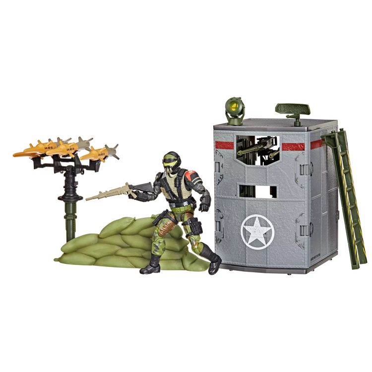 G.I. Joe is a highly skilled, on-demand, special operations force of men and women from around the globe tasked with defending the world from Cobra, a ruthless criminal organization bent on total domination. This Steel Corps Sentry figure comes with 3 character-inspired accessory pieces including knife and weapon accessories. The Modular Defense Post comes with 3 walls, floor, roof, and 41 accessory pieces including sandbag, weapons rack, 2 ladders, adjustable stands, satellite dish, search light, 4 missiles, ammo boxes, and weapon accessories; plus pegs, hinges, and connectors that also can attach to additional sets (Each sold separately) allowing you to create larger customized fortifications. Steel Corps Sentries are the guardian troopers who stop advancing enemies in their tracks.
