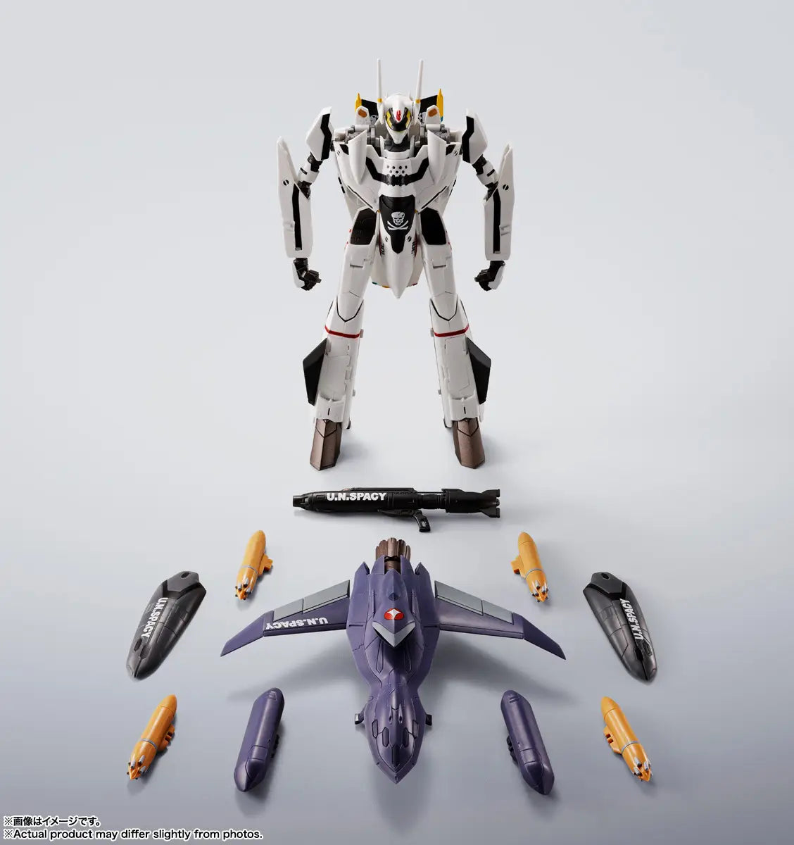 Includes: Main body, 4 pairs of interchangeable hands, pilot figure, main wings (L/R), suspension wings (L/R), small wings for Battroid, gunpod, 2 Pitot tubes (spare included), Battroid Pitot tube, open air intakes (L/R), landing legs, leg boosters (L/R), display joint parts, QF-2200D-B body, 8-barrel micro missile launchers (x4), mobile missile pods (x2), ghost-equipped Battroid jig parts, back parts for Ghost, support rod, and dedicated stand.