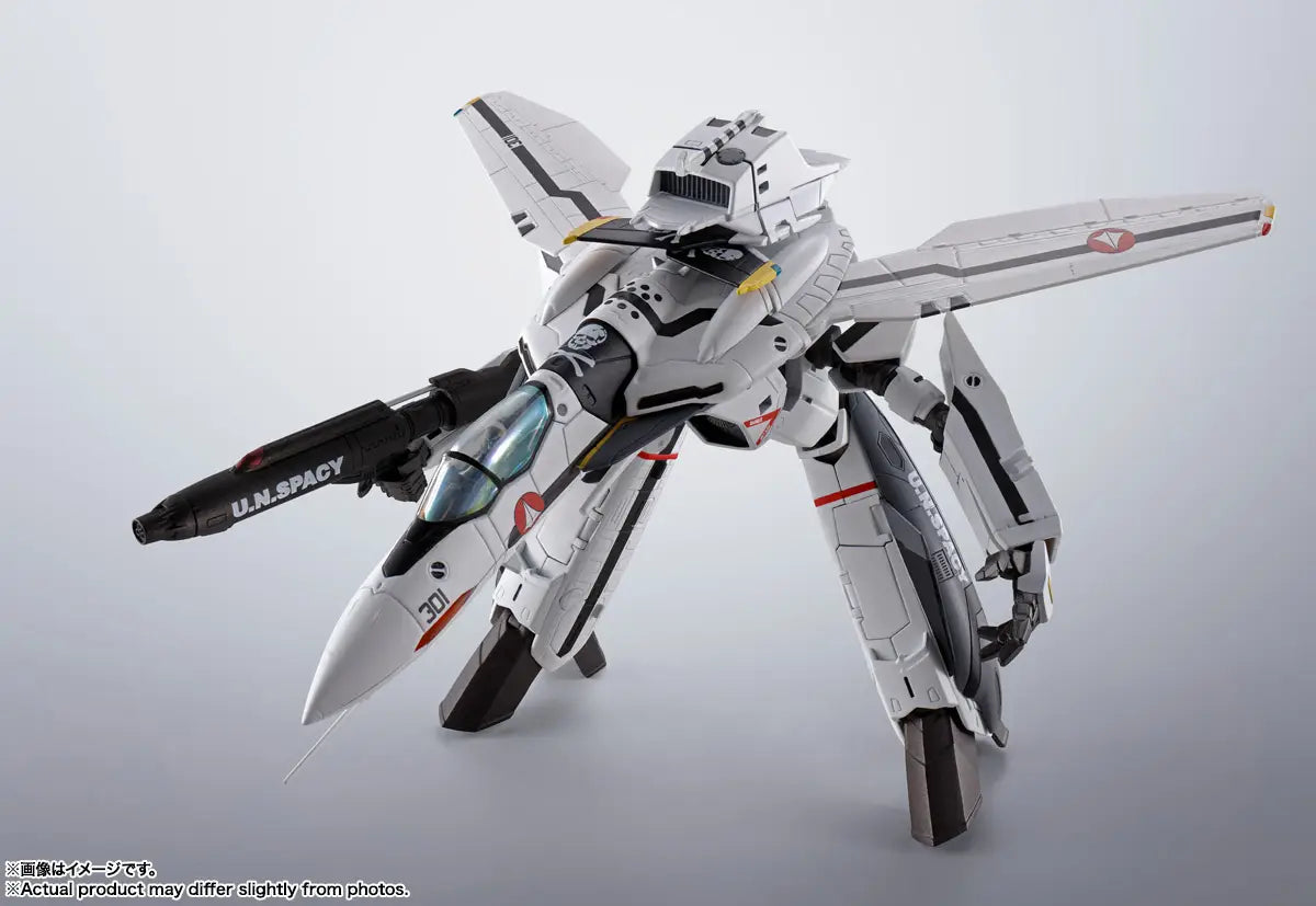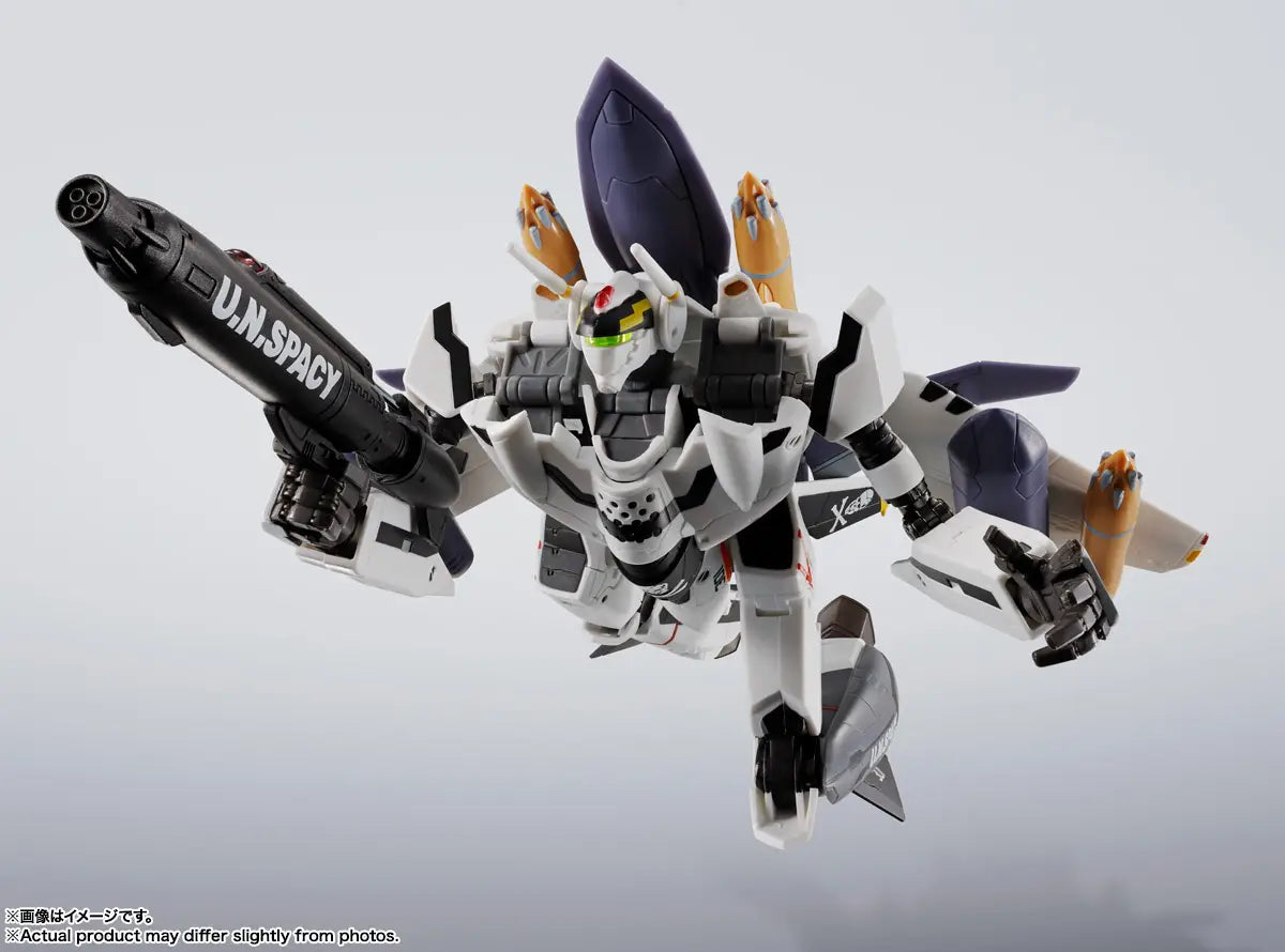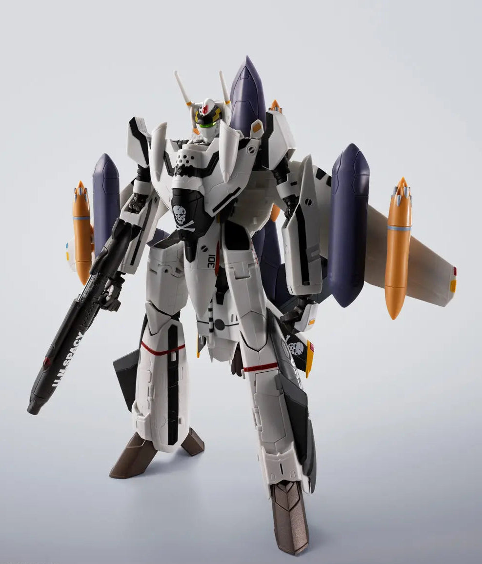 The VF-0S piloted by young Roy Focker returns with powerful gear! This 2022 release from the HI-METAL R "Macross Zero" series comes with Ghost equipment and various weapons. Enjoy the three-stage transformation, with or without the Ghost setup. A dedicated stand with a skull mark is also included.