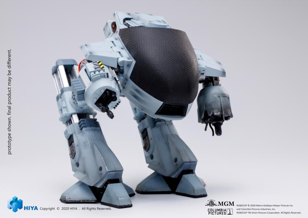 It is the city of Old Detroit. The time: tomorrow! Hiya Toys revisits the ED-209 figure with a special battle-damaged variant. With an exploded cannon on one arm, and featuring scars from its top-floor battle with Robocop, this film-accurate 1/18 scale figure stands 5 1/2 inches tall and is a perfect reproduction of one of the 80s coolest (and most incompetent) villains. The Battle Damaged ED-209 features a sound chip with movie-accurate sound effects and dialogue, while also featuring a new foot sculpt!