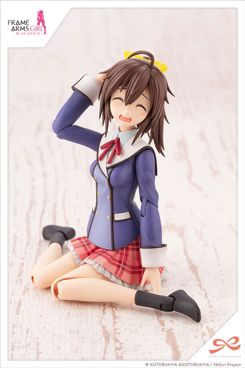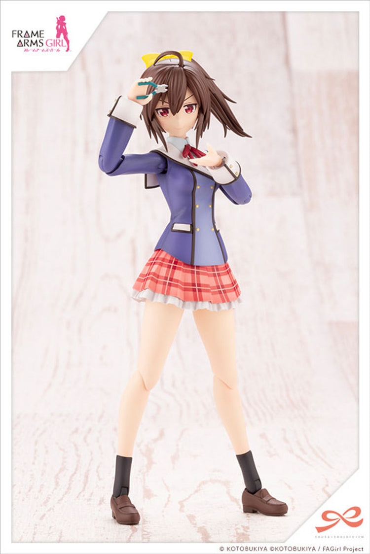 "Ao Gennai, the main character of the anime series Frame Arms Girl, is now available as a plastic model kit in Wakaba Girls’ High School winter clothes! The model is launched as part of the SOUSAI SHOJO TEIEN series, an easy-to-build plastic model kit series designed for first-time builders. Her various facial expressions have been made using the pre-painted face parts. Display it along with the After School Gourai Birthday Set launched simultaneously, and recreate your favorite scenes from the anime! ▼Product Highlights! [Two Types of Pre-painted Checkered Skirts] The model kit includes two types of skirts: one for a standing pose and one for a sitting pose. The checkered pattern on the skirts come pre-painted, so relax and enjoy the build! [Five Types of Pre-painted Face Parts] The kit includes five face parts, including a cartoonish face, which was voted most popular in a survey conducted by Kotobukiya. A standard, smiling, blushing, smug and cartoonish face come in both pre-painted versions and unpainted versions. *Please note that the face parts included in this kit are not compatible with the separately sold models from the Frame Arms Girl series or the SOUSAI SHOJO TEIEN series. [Waist Part for Sitting Poses] Thanks to the roll joints, the thigh parts are flexible, so the model can be displayed in a W-sitting pose as well as a more standard sitting pose. [16 Colors — the Most in the Series] This adorable plastic model has been created by a combination of many colored parts: skin color, brown, yellow, purple, light purple, red, white, light blue, coral pink, black, dark brown, pink, green, gray green, silver, and blue. [Various Accessories to Decorate Ao] The school bag is made in three colors with a different colored zipper part. It also comes with an Udolla figure, the unofficial character of Tachikawa City in Tokyo. The Kotobuki Nipper can be placed in Ao's hand using the special gripping hand. The kit also includes the smartphone from the anime's battle scenes, specially designed for the Ao model. [Compatibility] The diameter of the neck ball joint is 5mm. The head part can be exchanged with separately sold characters from SOUSAI SHOJO TEIEN, Frame Arms Girl, or ARCANADEA. The kit also includes a neck part to make the model compatible for Megami Device models, too! Included Items: Ao Gennai Model x1 Set Face Parts: Standard, Smiling, Blushing, Smug, Cartoonish (Pre-painted and Unpainted) Skirt Parts (Two Types): Standard Type and Sitting Type x1 Each *Note that the sitting type can be used with the special thigh parts. Nine Types of Hand Parts: V Sign, Gripping (for Nipper), Gripping (Standard), Gripping (Narrow), Gripping (Wide), Gripping (round), Fist, Finger Pointed, Open (Left and Right Each) Bare Feet Parts x1 Set Smartphone x1 Nipper x1 School Bag x1 Set 6mm Diameter Neck Part for Megami Device Models x1 Set Display Base x1 Set Decals for Facial Expression x1 Sheet"