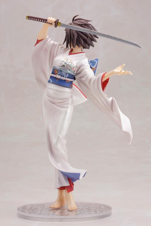 The girl with the Mystic Eyes of Death Perceptionis frozen in a sweeping gesture as she whips her deadly katana at an opponent, her body twisting around with the weapon held up near her head. Shiki’s beautiful white kimono with detailed decoration flows gracefully around her as she spins, its intricate sculpt appearing just like real clothing and imbuing the presentation with a powerful element of motion.