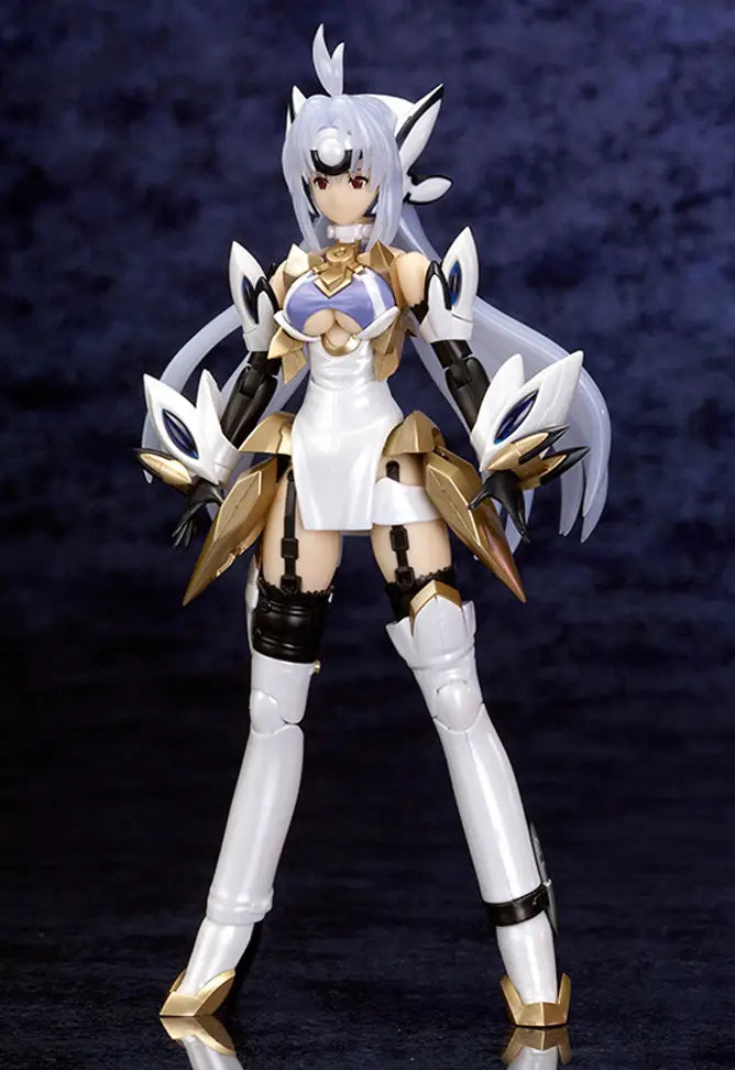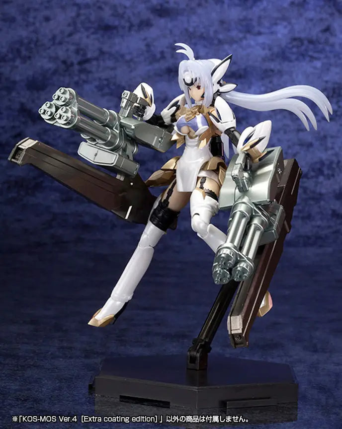Kotobukiya's model kit of KOS-MOS Ver. 4 is back! Her skin is molded in a realistic matte finish, and her eyes are pre-painted; in addition, the gold parts and the silver of the hand vulcans are also pre-painted, and this "Extra Coating" edition adds a pearlescent finish to many of her parts! Since she's molded in multiple colors, you'll get an end result very close to the illustrations just by assembling her. The character designer CHOCO illustrated her four prepainted faces; you can replace the front hair parts to recreate her "Fatima Glass Mode"! Large-volume weapons such as a triple hand vulcan, handgun, and Dragon Tooth are included. Her chest parts can be replaced to recreate the "D-TENERITAS" seen at the end of the story! She's also compatible with the Mechanical Flying Base 3 (sold separately) to enjoy a wide range of poses! Order her for your own collection today!