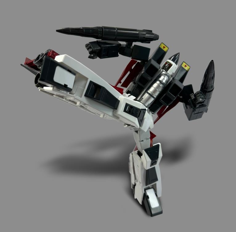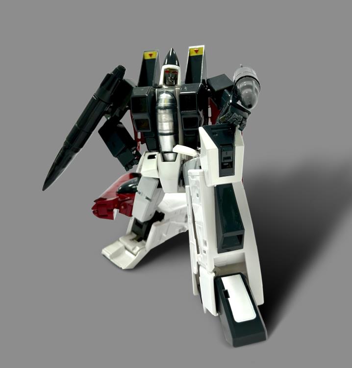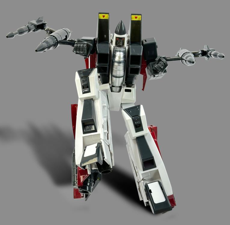 Booster, part of the RE:Master line, is a reissue with updated paint and engineering. Booster converts from robot to fighter jet and features a fully articulated design.