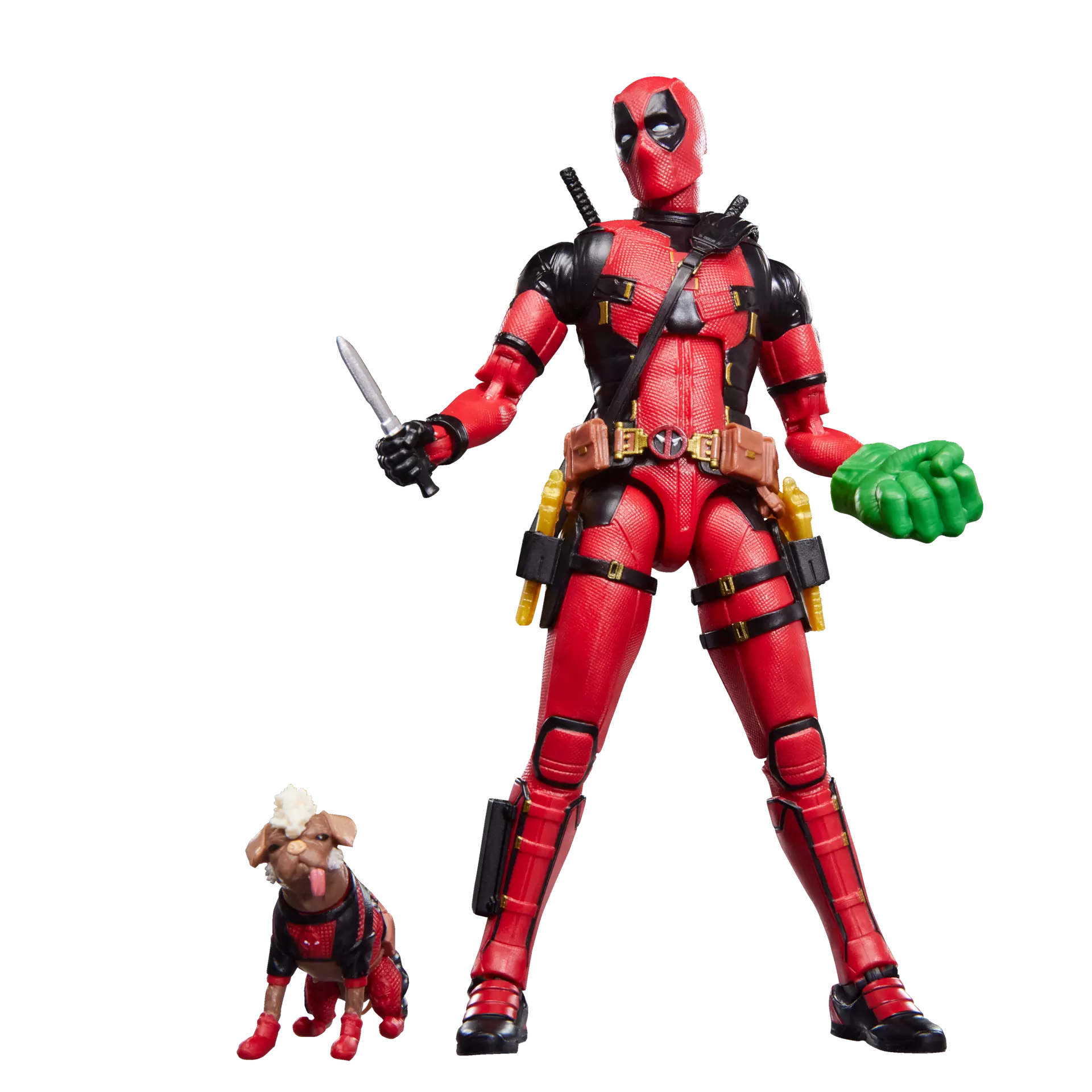 These collectible 6-inch scale Marvel figures are detailed to look like the characters' appearances in Marvel Studios' Deadpool & Wolverine. Deadpool figure is fully articulated with premium design and poseable head, arms, and legs. Dogpool figure is non-articulated, but still delightful. Marvel action figure set comes with 17 accessories, including multiple sets of alternate hands (Hulk, what are you doing here!?) and some of Deadpool's favorite weapons. Also includes Wolverine skeleton piece accessories inspired by the iconic opening scene of the movie.