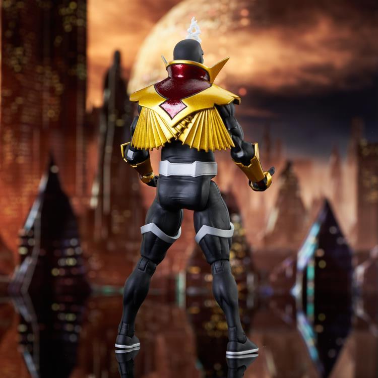 As seen in the Secret Invasion comic: Illuminati beware! Your ranks have been infiltrated by the Skrulls, and this Super Skrull has the powers of all of the Illuminati combined! Never before made as a toy, this green-skinned Skrull comes dressed in an Illuminati-inspired outfit, and includes an interchangeable masked head, as well as interchangeable hands and a devastating Black Bolt sonic attack piece! Standing approximately 7" tall and featuring 16 points of articulation, this collector's action figure comes in Select packaging, with side panel artwork for shelf display. Designed by Eamon O'Donoghue and sculpted by Gentle Giant Studios, don't miss out and order yours today!