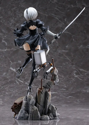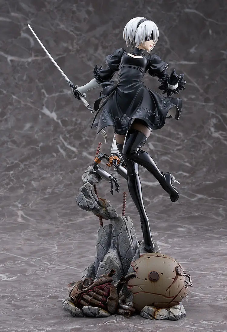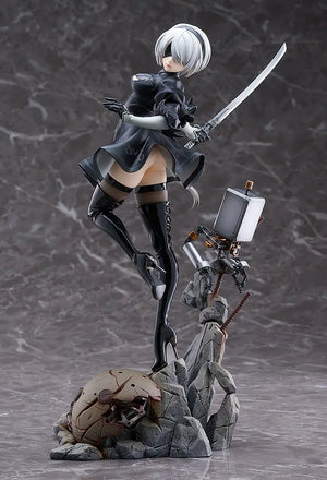 From the anime "NieR:Automata Ver1.1a" comes a 1/7 scale figure of the YoRHa soldier 2B. 2B has been sculpted in a dynamic pose with Virtuous Contract in hand, perched on top of the rubble caused by a fierce battle with a Machine. Careful attention has been paid to the details of the figure, such as the sculpting of 2B's slender yet strong physique, the matte finish of the outfit and the luster of the boots.