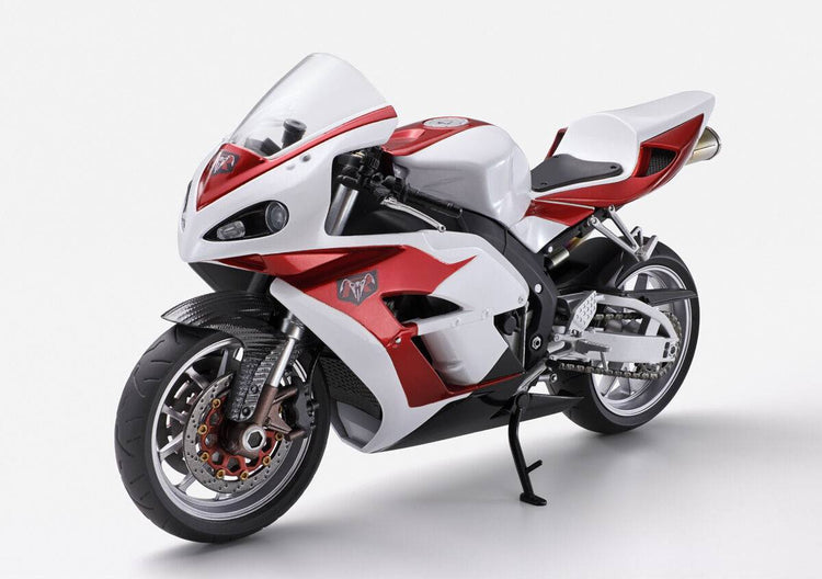 The figure showcases meticulous detailing, with clear parts used for the screen and headlight, and a metallic red paint finish that replicates the distinctive body of the bike. The exhaust is highlighted with vibrant gradient coloring. It includes articulated handlebars, a side stand, and a rear-wheel suspension mechanism. The shoulder and abdomen joints allow for a deep, forward-leaning riding position, bringing the high-speed action scenes from the film to life. Additionally, as a bonus part, the set includes a hand-held mask for the separately sold "S.H.Figuarts Kamen Rider No. 1/Takeshi Hongo (Kamen Rider THE NEXT)" figure, allowing you to recreate iconic poses with the mask held under the arm.
