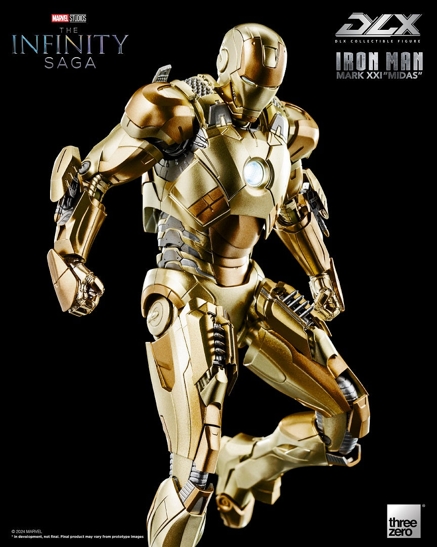 threezero and Marvel Studios are excited to unveil the DLX Iron Man Mark 21 “Midas” figure, part of the Marvel DLX series. This 6.8” collectible features a stunning gold design inspired by the mythical King Midas, with a multi-layer metallic finish that mirrors Tony Stark’s iconic suit.