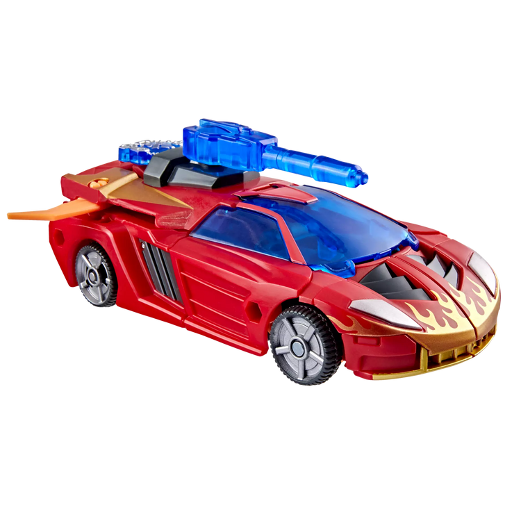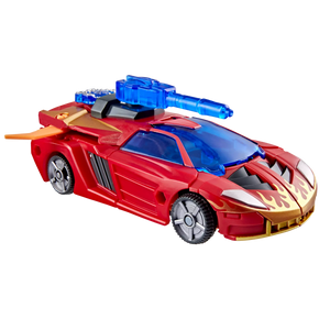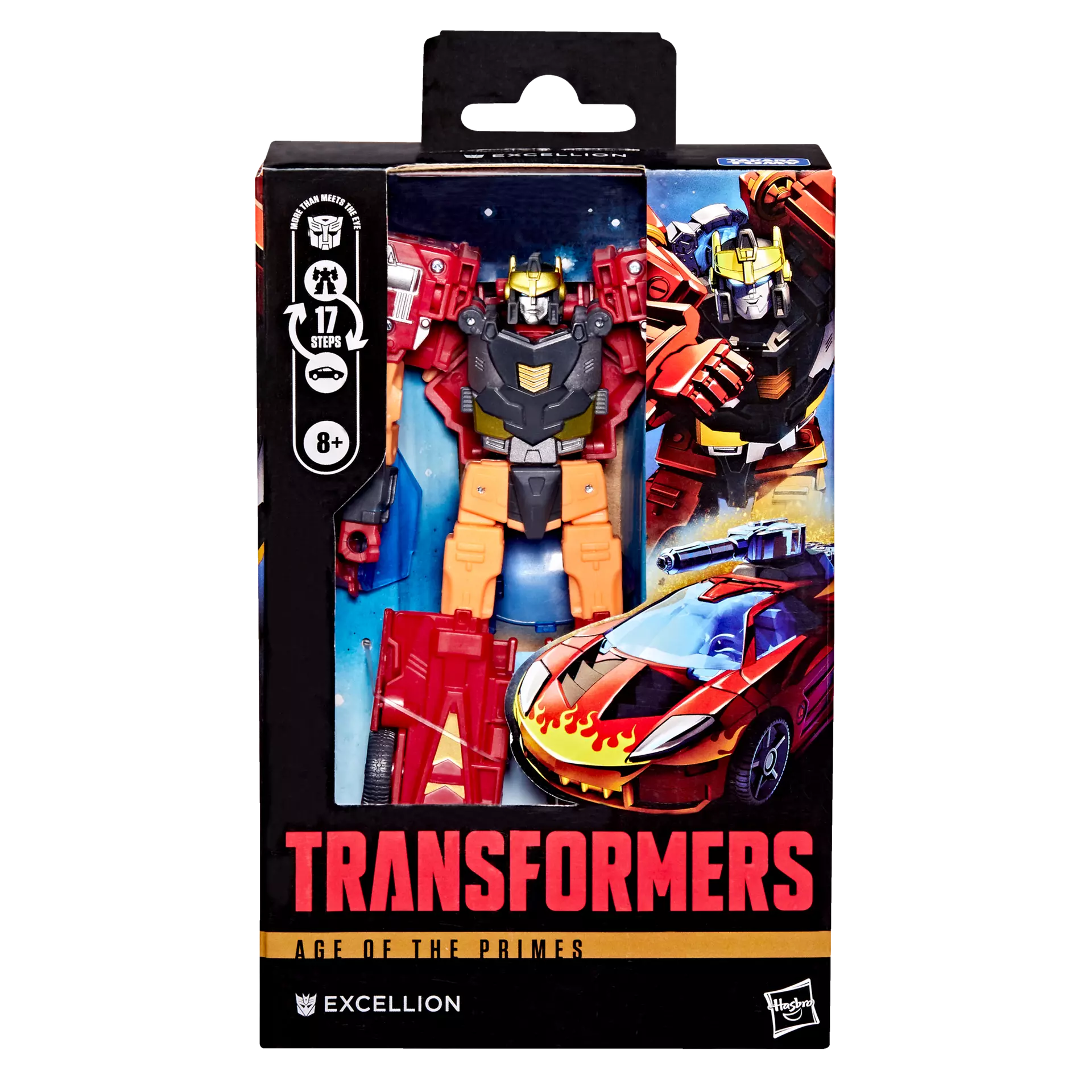 Celebrate the 20th anniversary of the Transformers: Cybertron animated series with the Transformers Age of the Primes Deluxe Class Excellion action figure! This 5.5-inch Excellion action figure converts between robot and sports car modes in 17 steps. Includes blaster and Cyber Planet Key accessories. Features articulated head, arms, and legs for awesome action poses.