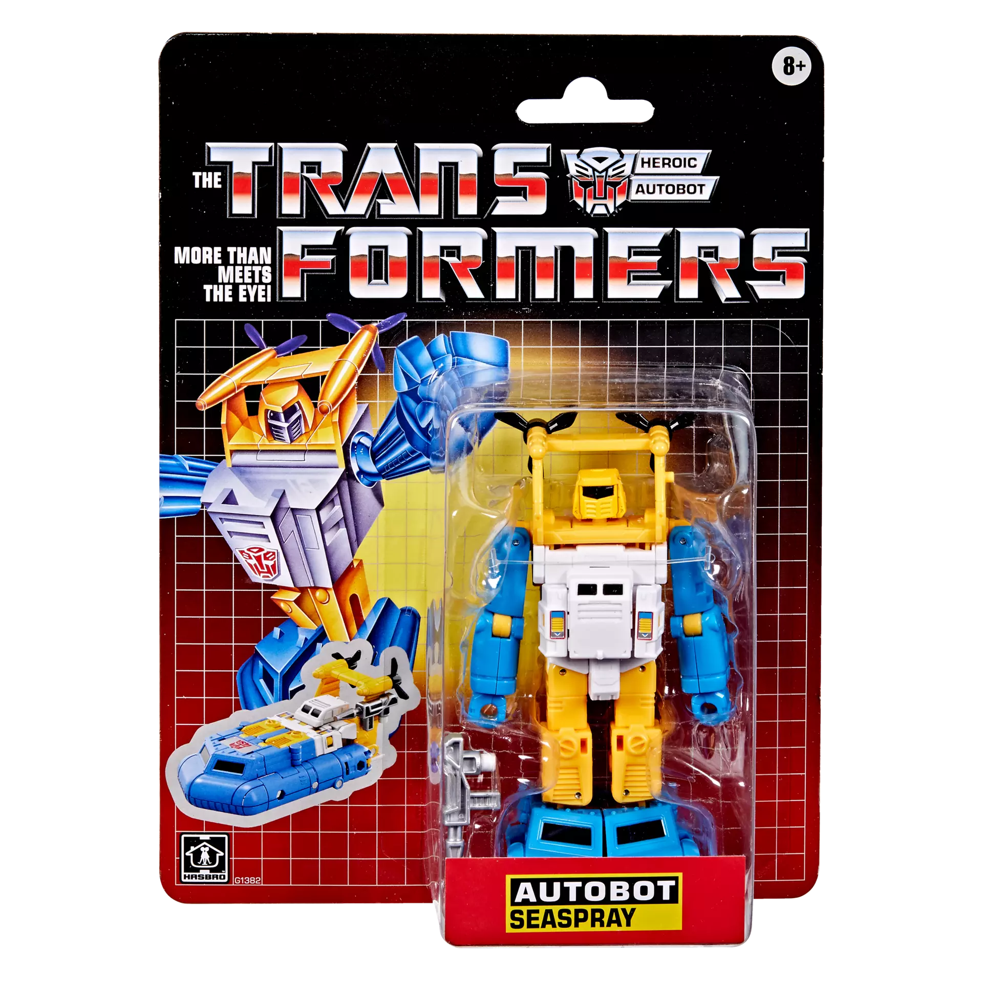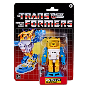 Seaspray displays a zest for his job unmatched by fellow Autobots. He loves the ocean and its creatures, and he loves the thrill of naval battle. Transformers Retro G1 action figures feature vintage styling, accessories and special packaging artwork and tech specs.