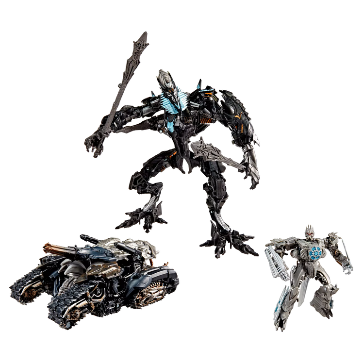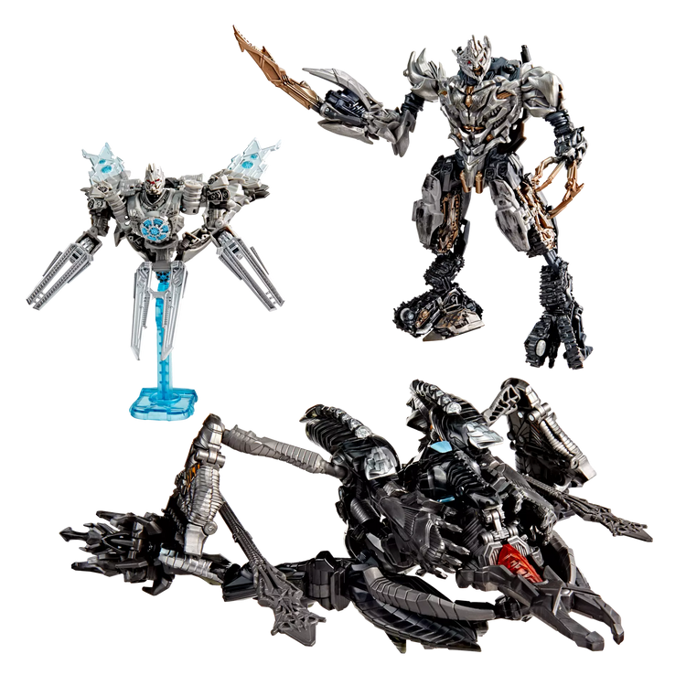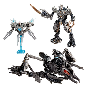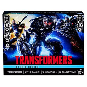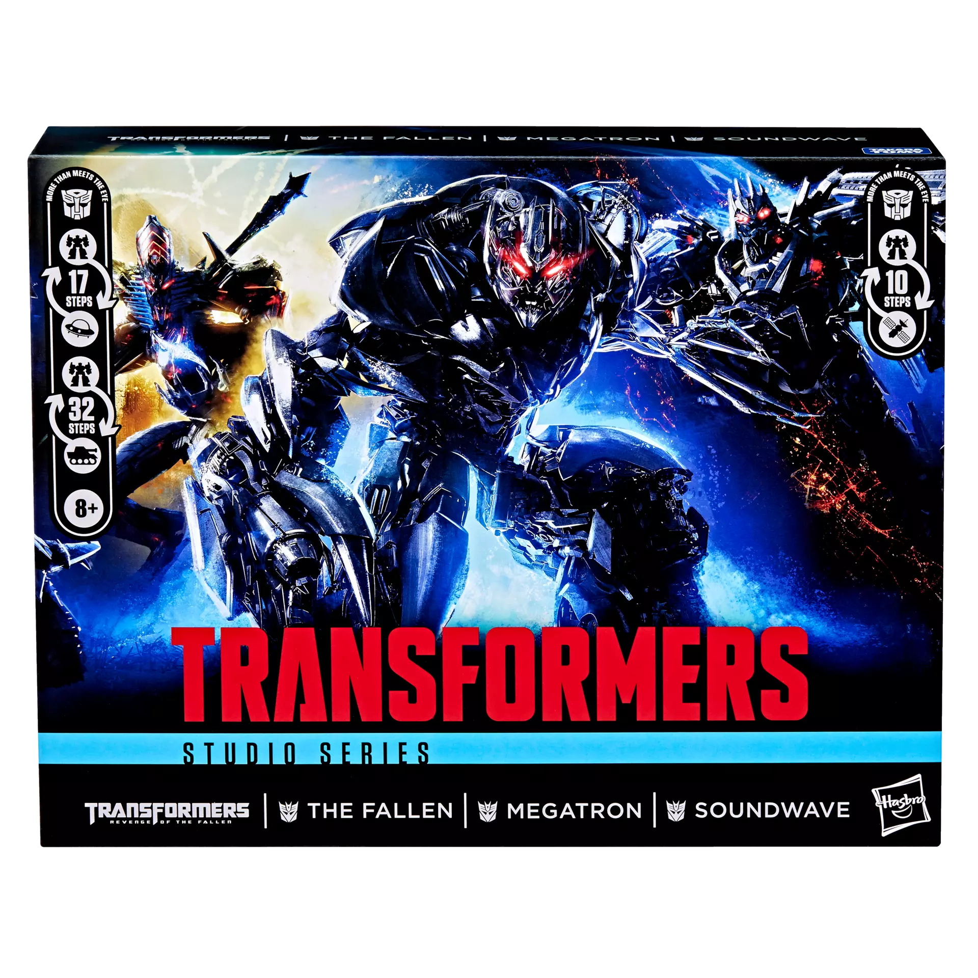 Experience the epic action of the Transformers: Revenge of the Fallen movie with this set of 3 Transformers Studio Series action figures! The set includes 8.5-inch Leader Class The Fallen action figure that converts from robot to Cybertronian spacecraft in 17 steps, 6.5-inch Voyager Class Megatron action figure that converts from robot to Cybertronian tank in 32 steps, and 4.5-inch Deluxe Class Soundwave action figure that converts from robot to satellite in 10 steps. Look for more Transformers collectible toys (sold separately, subject to availability) featuring favorite characters like Optimus Prime, Bumblebee, and more to create a lineup that is — More Than Meets the Eye.